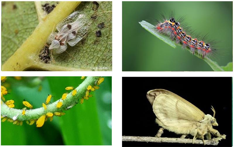 方翅網(wǎng)蝽、松毛蟲、青蟲、食心蟲、棉鈴蟲等。
